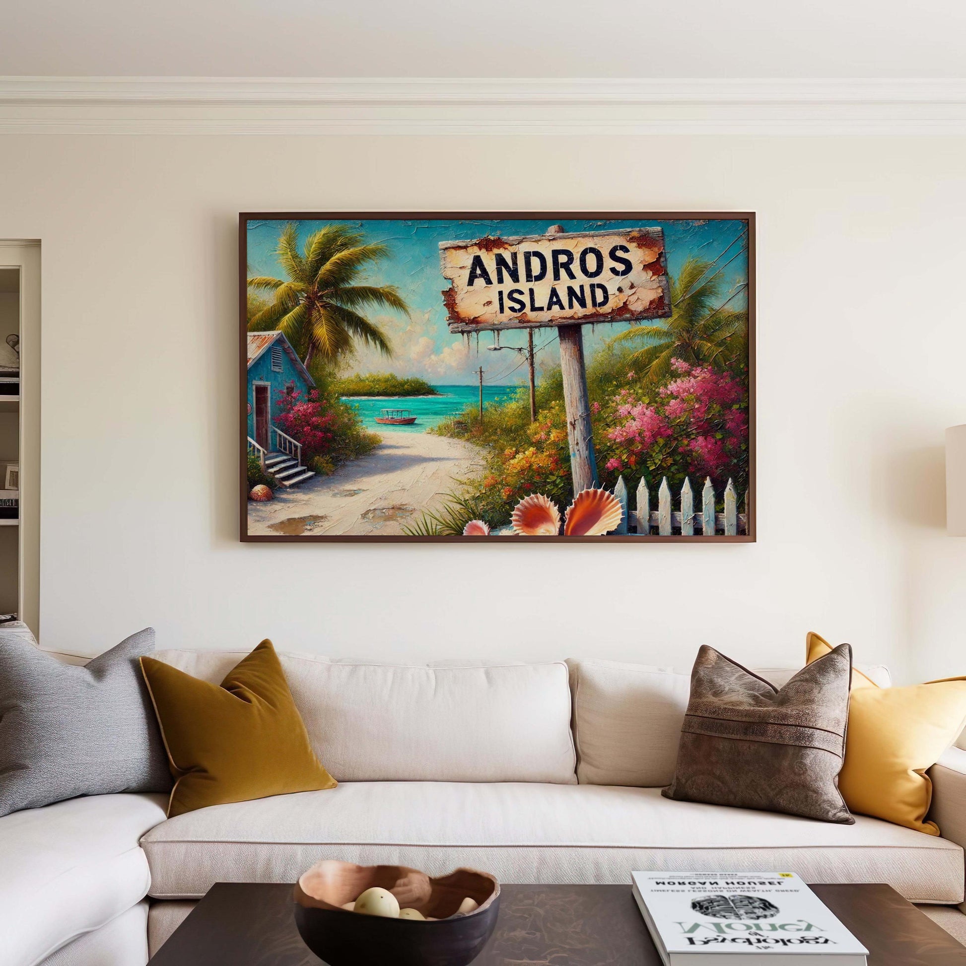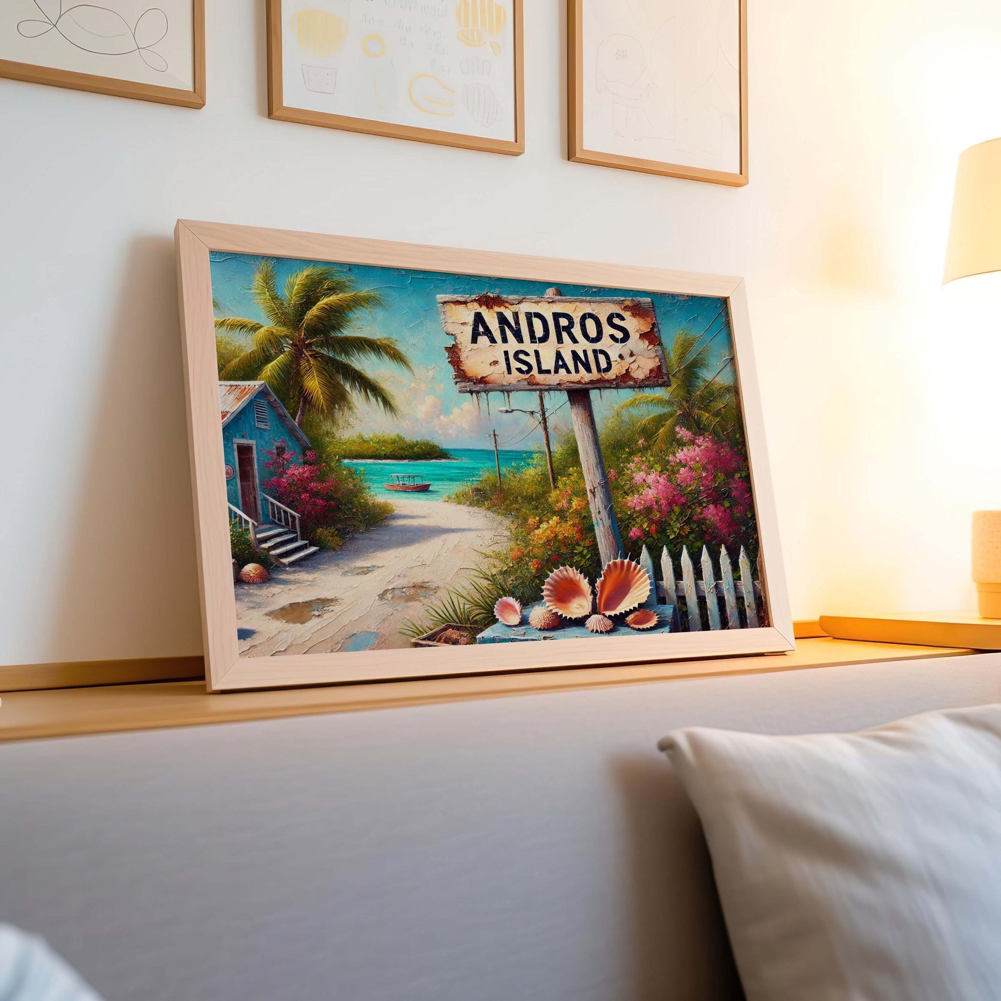 Bring the tropical charm of the Caribbean into your home with this stunning Andros Island Bahamas Art print, perfect for coastal beach wall decor and nautical coastal accents. Featuring a vibrant scene of the island’s pristine beaches, lush palm trees, and colorful flowers, this tropical ocean map print captures the serene beauty of Andros Island — the ultimate island poster for lovers of Caribbean art and nature. Whether you're decorating a beach house, adding a touch of paradise to your living space, or searching for a memorable Caribbean island souvenir, this ocean print is a captivating choice.
