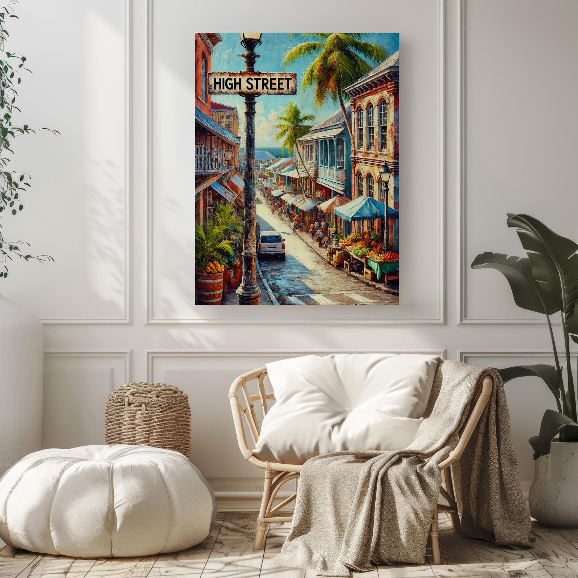 High Street – Stroll through the lively heart of St. John’s with this High Street wall art print, a perfect piece for travelers and lovers of Antigua and Barbuda’s island charm.