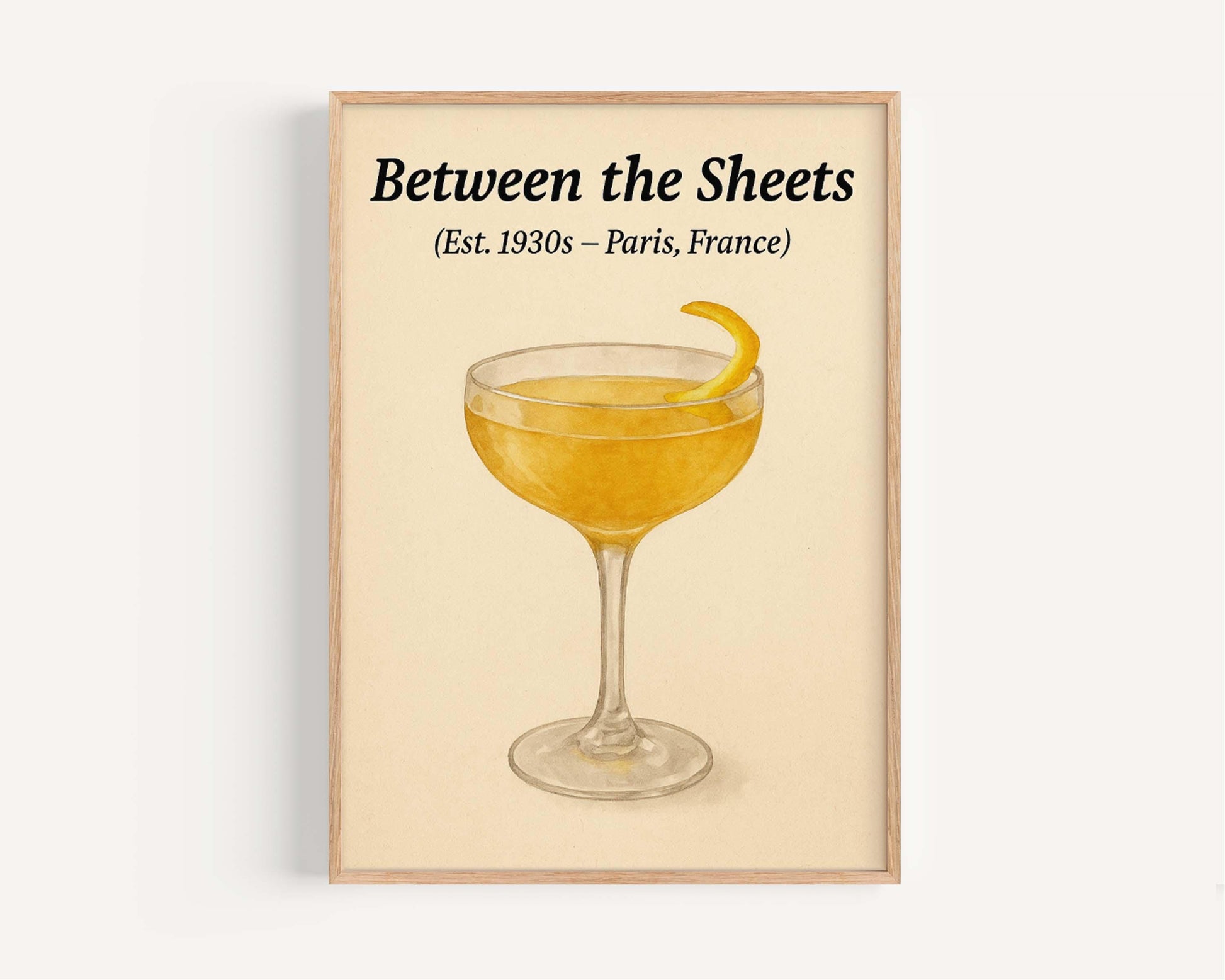 Add a touch of vintage charm to your bar or drink nook with this Between the Sheets Cocktail Artwork. Featuring a beautifully illustrated retro drink poster, this liquor and alcohol-themed wall art celebrates classic cocktail culture with style and sophistication. Perfect for taverns, home bars, or as a unique gift for cocktail enthusiasts, this bar wall decor captures the essence of vintage bartending with a playful twist.
