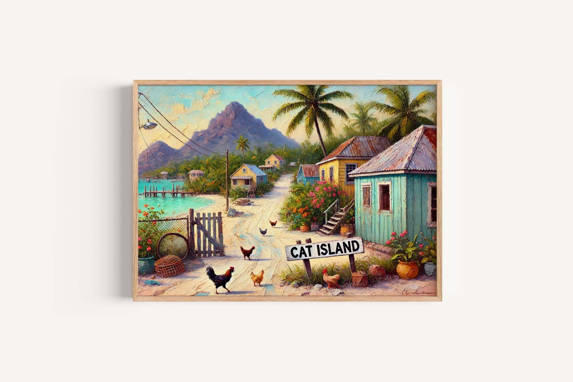 Whether you're dreaming of a beach getaway or looking for a unique Caribbean art piece, this island poster offers a picturesque view of Cat Island's charming scenery. Featuring colorful cottages, lush palm trees, and a serene ocean backdrop, it evokes the tranquility and vibrancy of this tropical haven.