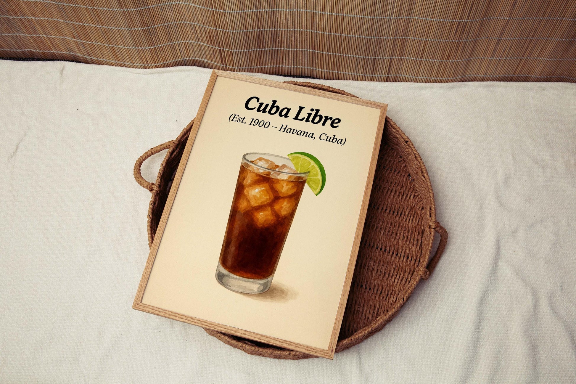 This vintage-inspired print features a detailed illustration of a refreshing Cuba Libre served over ice with a lime wedge, set against a warm, inviting background. The piece celebrates Havana Cuba’s rich cocktail history, making it a perfect conversation starter and a great gift for spirits lovers, bartenders, or anyone who appreciates tropical decor.
