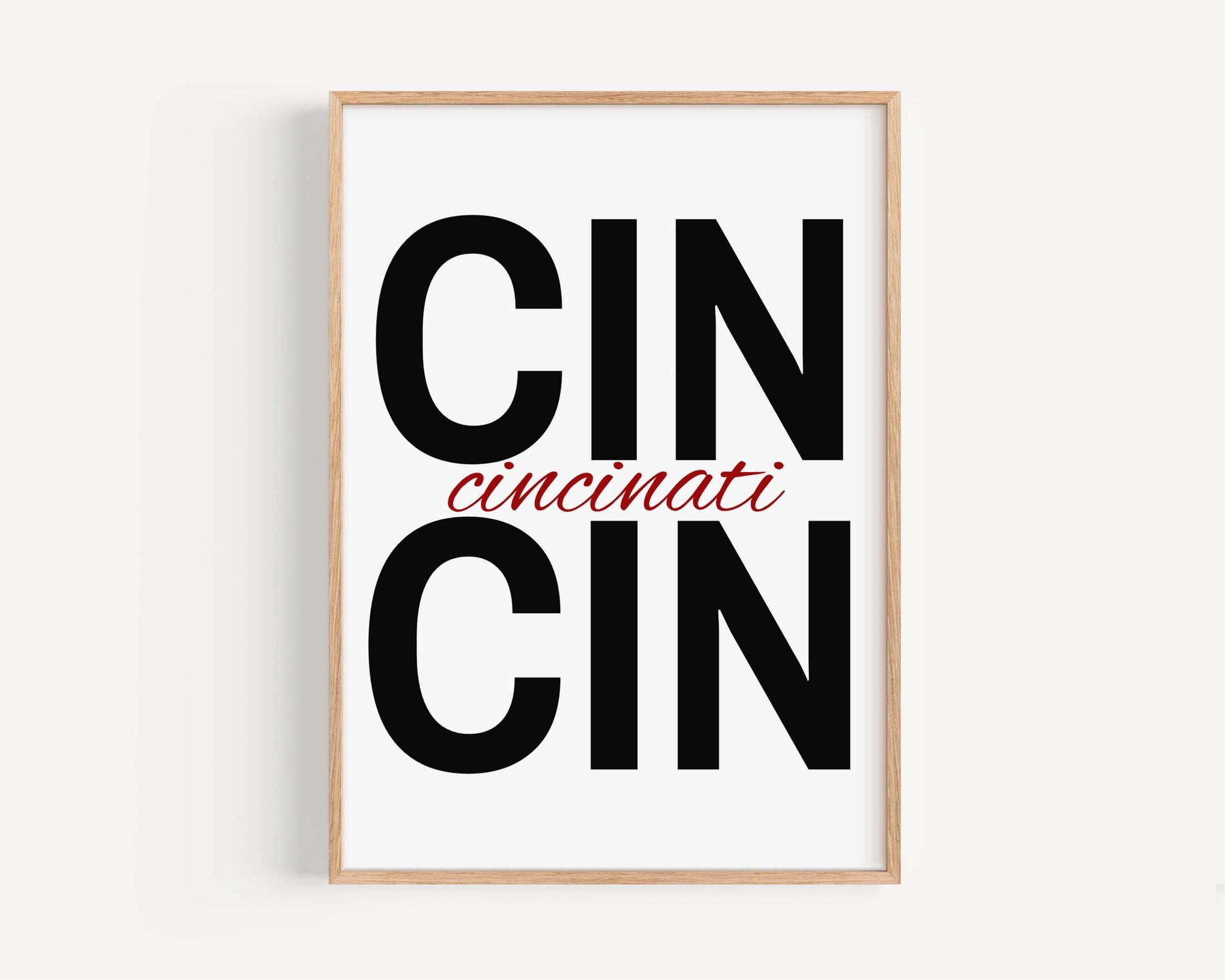 Crafted with high-quality materials, this poster features bold black skyline silhouettes contrasted with the elegant red cursive "cincinnati" script, creating a contemporary and chic aesthetic. The clean design and sleek frame make it a versatile piece that complements various decor styles, from modern to industrial.
