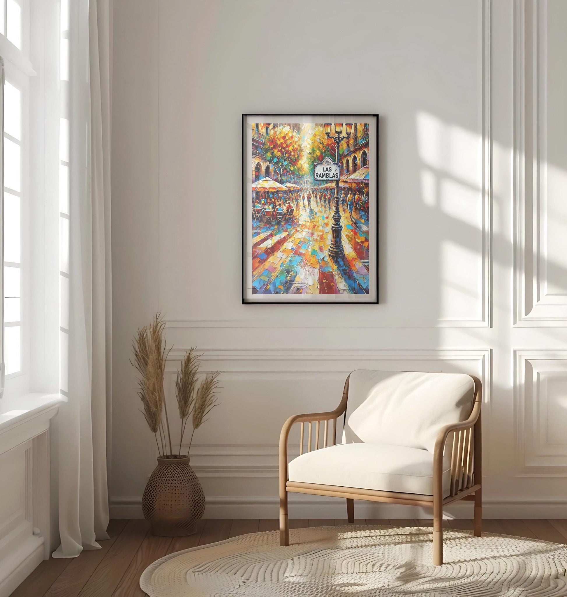Las Ramblas Wall Art – Capture the unique charm of Las Ramblas with this stunning wall art print, perfect for home décor, housewarming gifts, or anyone who loves Barcelona’s iconic scenery. This vibrant piece showcases the lively promenade, street performers, and rich cultural vibe of Las Ramblas, making it a perfect gift for Spain lovers and travel enthusiasts.