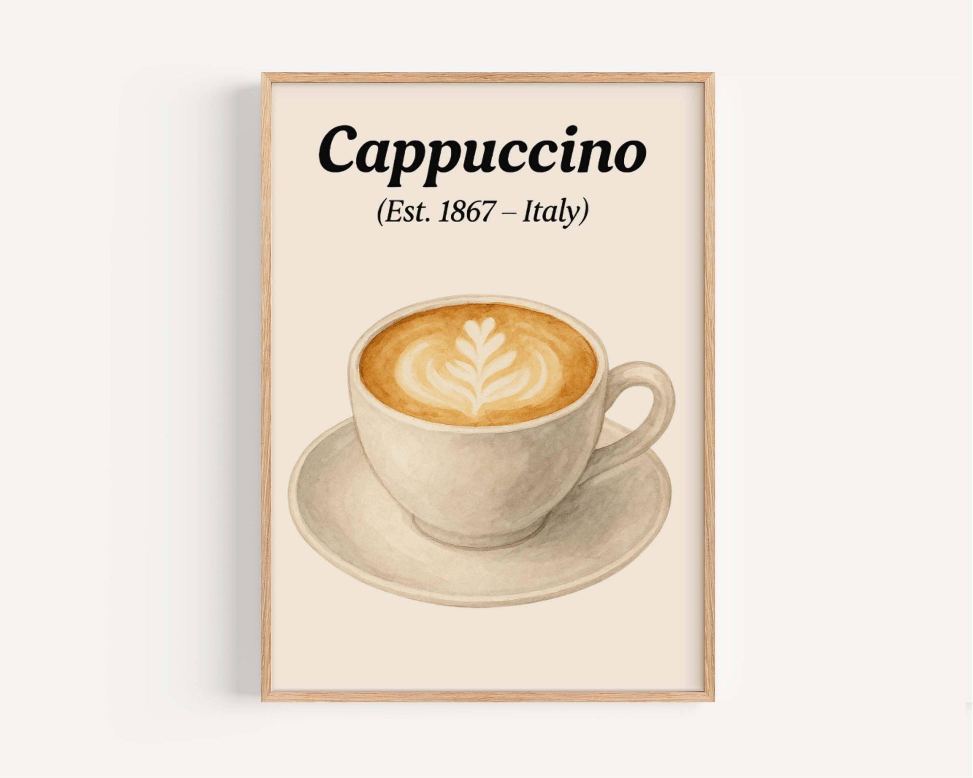 Bring warmth and charm to your kitchen or coffee shop with this delightful Cappuccino Artwork. Perfect for coffee lovers, this minimalist coffee art poster captures the inviting essence of a freshly brewed latte with beautiful latte art details. Whether you're decorating your home café, adding a cozy touch to your kitchen, or searching for a thoughtful gift for coffee enthusiasts, this coffee wall decor is an ideal choice.