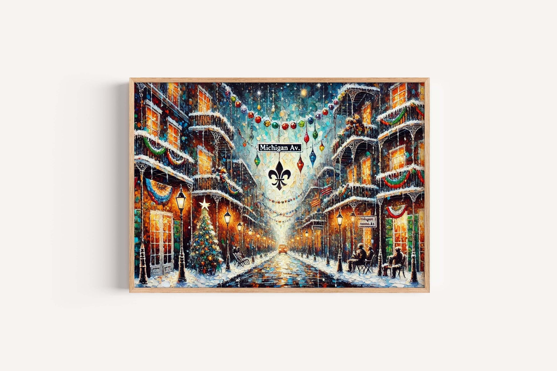 Celebrate the magic of a Chicago winter with this cozy, snow-dusted Michigan Avenue holiday art print. Vibrant garlands, twinkling lights, and historic buildings adorned in red, white, and green create an inviting holiday street scene. Whether you're a Windy City native or simply drawn to the charm of city streets at Christmas, this piece captures the heart of holiday nostalgia.