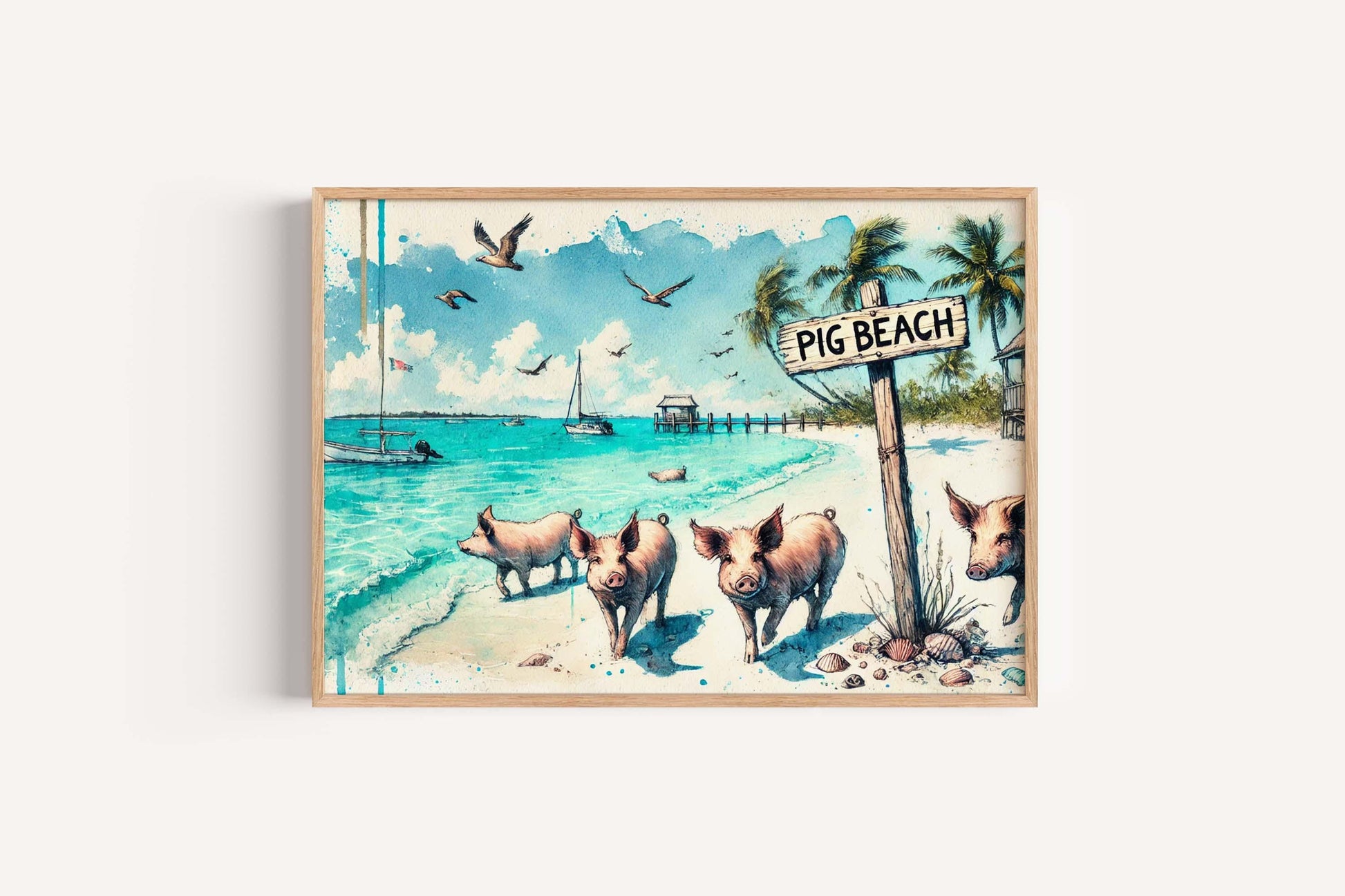 Bring the tropical charm of the Bahamas into your home with this stunning Pig Beach Wall Art, featuring the iconic swimming pigs of Exuma. This Caribbean-inspired island poster captures the playful spirit and breathtaking scenery of Pig Beach, making it the perfect coastal decor for beach lovers and island enthusiasts alike.